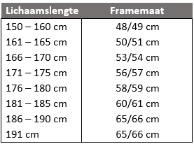 De framemaat van een tweedehands fiets hangt af van uw lengte. Hieronder ziet u welke framemaat geschikt is voor stadsfietsen. U kunt maximaal 2 cm afwijken van de aanbevolen maat; dit is slechts een richtlijn.